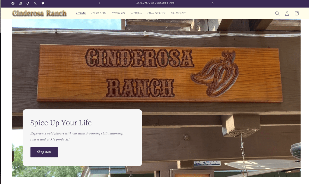 Cinderosa Ranch is a small‐to‐medium sized specialty foods / seasoning & condiments brand (chilis, sauces, pickles etc.) selling via their Shopify store and online catalog. Their identity is deeply rooted in chili competition (Cindy Reed Wilkins is a champion chili maker) and artisan flavor.
