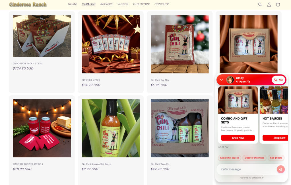 - The bot was trained using Cinderosa Ranch’s own FAQ content, product descriptions, ingredient lists, shipping & return policies, etc., so it could answer accurately about products (heat level, usage), ingredients (allergy info), shipping times/costs, current stock, etc.