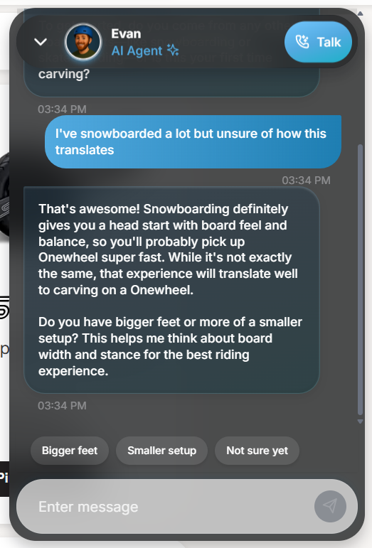 Together, Onewheel and Omakase.ai launched a conversational AI Board Finder, featuring a custom-tuned agent named Evan. Evan was accessible through intuitive, on-brand Board Finder entry points across the site’s navigation and collections pages.