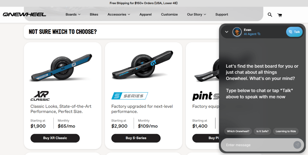 Beyond product complexity, Onewheel also prioritizes its specific brand voice. The site’s look, feel, and tone reflect a curated lifestyle. Adding a generic AI widget wasn’t an option — any solution needed to feel like a natural extension of the brand, not an afterthought.