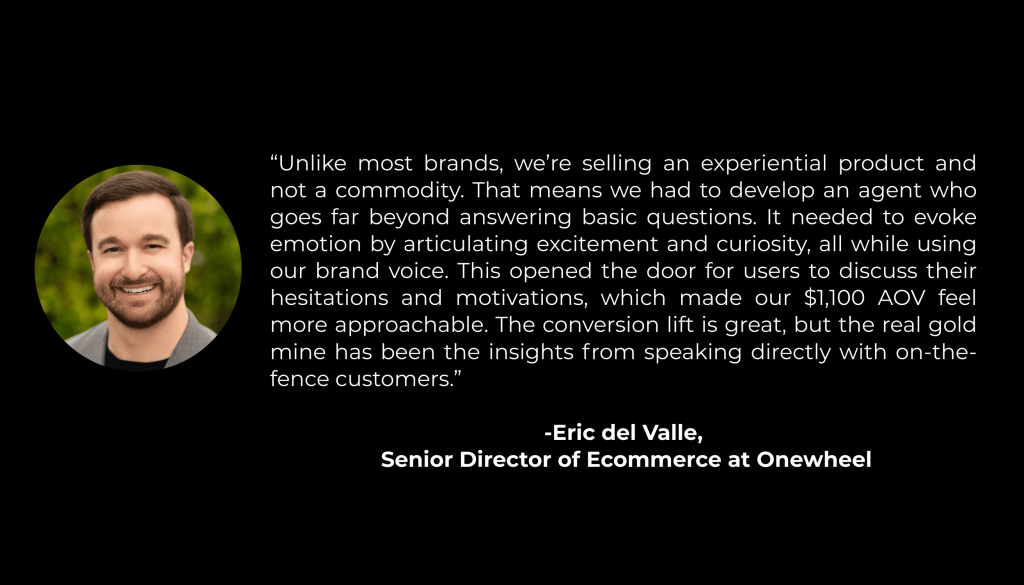 By combining natural conversation with authentic rider voice, deep product knowledge, and seamless integration, Onewheel transformed decision fatigue into confident action. The result was measurable revenue impact, richer customer understanding, and a scalable way to deliver white-glove expertise — precisely when demand was highest.